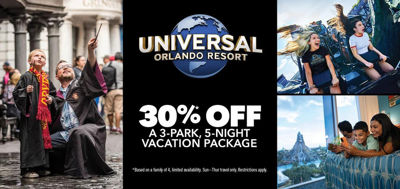 Save 30%* on a 3-Park, 5-Night Hotel + Ticket Package