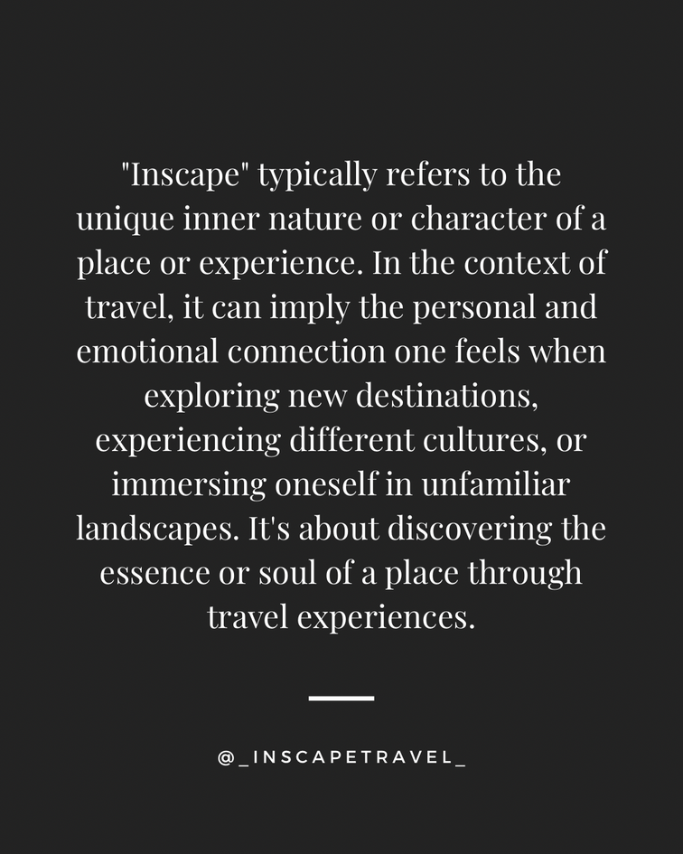 The name "Inscape Travel" was born from the idea that travel allows us to escape our ordinary surroundings and tap into our inner world of thoughts, emotions, and imagination. The term 'inscape' refers to the unique, personal landscape of our inner selves, shaped by our experiences, memories, and desires. When we travel, we step out of our routine and into new environments that awaken our senses and spark our imagination. At Inscape Travel, we curate journeys that invite you to venture beyond the familiar, explore new horizons, and connect with the world around you. Join us on a path of self-discovery, as we traverse the outer landscapes and inner worlds, together.